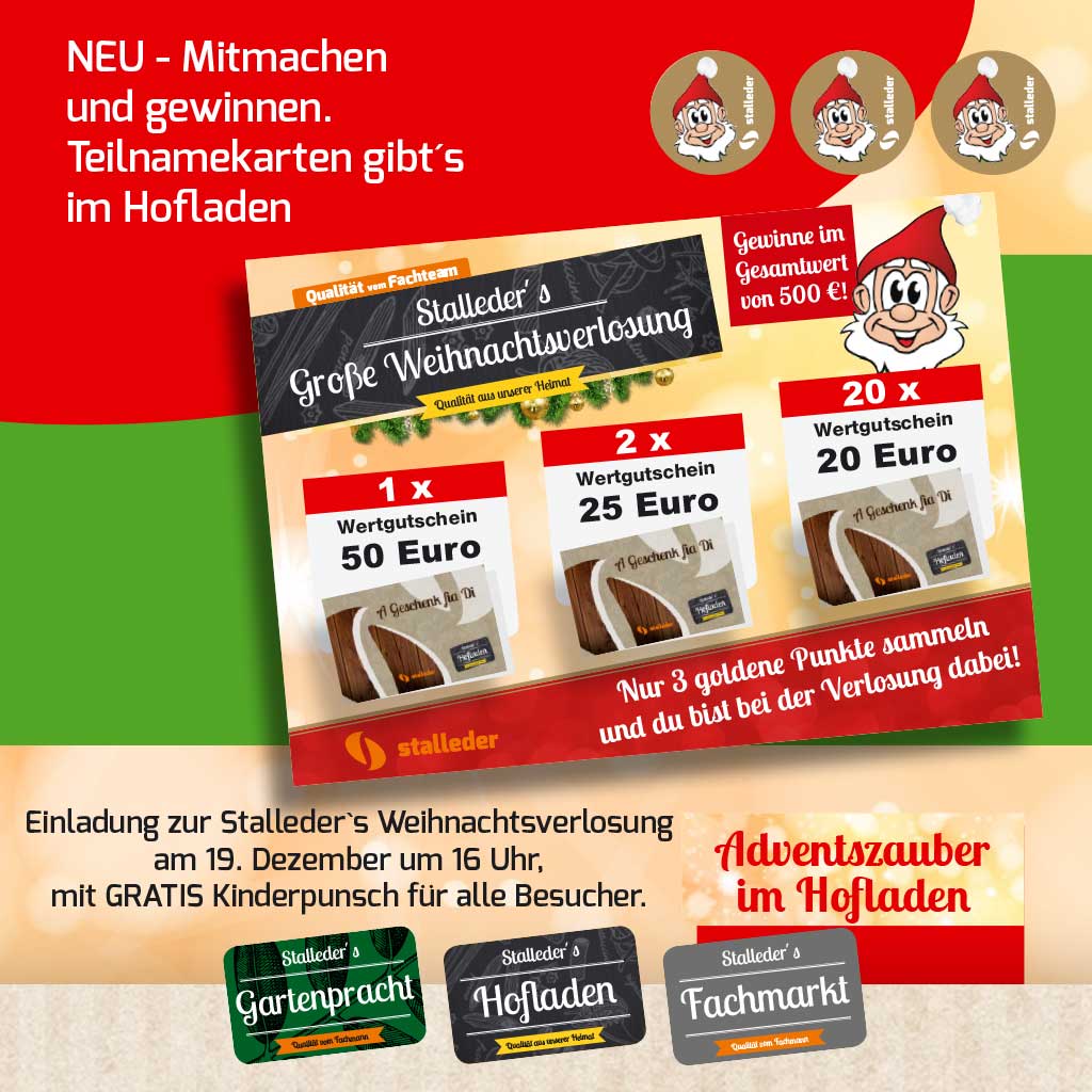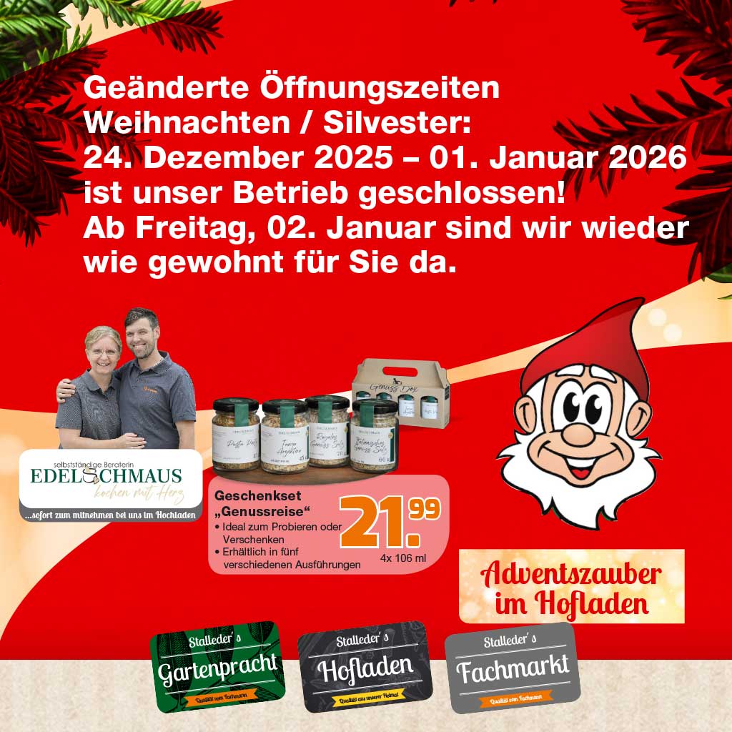 Unser Stalleder Fachmarkt und Stalleder’s Hofladen bieten Ihnen rund um Haus, Hof, Garten, Tier und Landwirtschaft die verschiedenen Produkte und Dienstleistungen an. Wir sind Ihr Ansprechpartner für Tiernahrung und für die ganzjährige Blumen-, Garten- und Rasenpflege.
